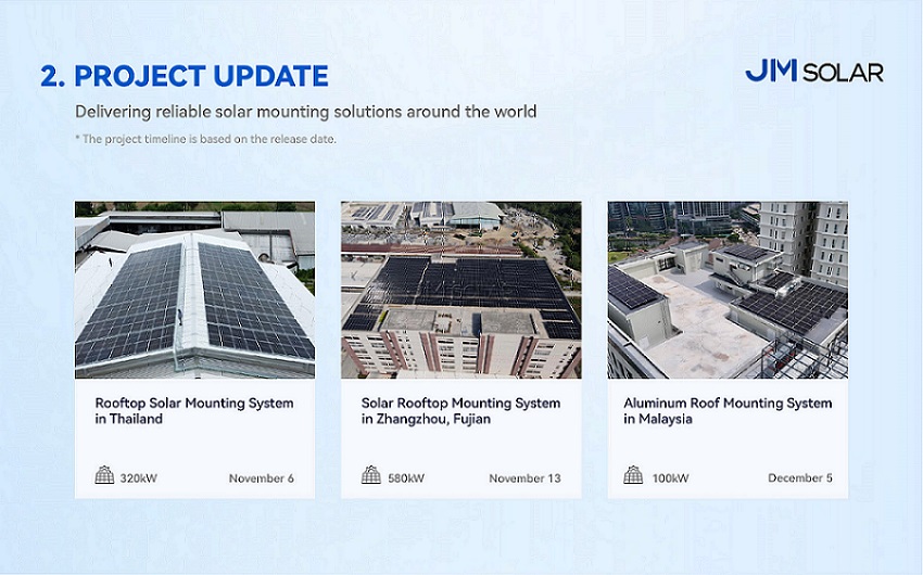 Il 6 novembre, un Progetto da 320 kW su tetto in Thailandiaè stato completato utilizzando il sistema di montaggio sul tetto di JinMega, offrendo un equilibrio tra installazione rapida e prestazioni di carico affidabili nelle condizioni climatiche locali. Il 13 novembre, un Progetto su tetto da 580 kW a Zhangzhou, Fujianha dimostrato la compatibilità del nostro sistema con i tetti commerciali di grandi dimensioni, supportando una costruzione efficiente e una stabilità a lungo termine. Il 5 dicembre, un Progetto di montaggio di un tetto in alluminio da 100 kW in Malesiaha evidenziato i vantaggi dei materiali leggeri abbinati alla resistenza alla corrosione, ideali per gli ambienti tropicali.